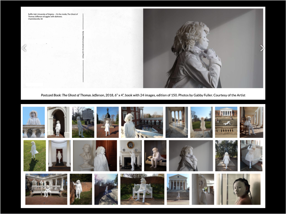 As the Ruffin Distinguished Artist in Residency in the Spring of 2018, Williamson adopted the persona of The Ghost of Thomas Jefferson in order to re-present the ubiquitous figure in a new light. Around campus, Jefferson is revered. However, Williamson's video and performance work over the past five years, for which she have embodied the persona of Sally Hemings, compelled her to take a more dialectic approach to the man and his legacy. The performance of the The Ghost and the subsequent portraits are intended to be at once playful and haunting. Questions of ‘whiteness’ and its material, aesthetic, and political value, history and its echoes in the present day, and identity as a construct of narrative were on her mind when developing this image.